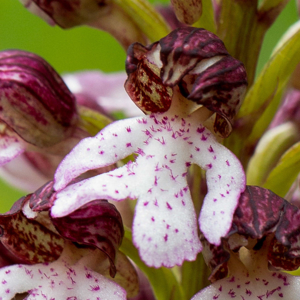 L'Orchis pourpre comme son nom l'indique possède des fleurs dont le casque, formé par les tépales supérieurs et latéraux, est de couleur pourpre. Le labelle est blanc au contour rose et est ponctué de "poils" également de couleur rose. Plante atteignant 20 à 40 cm. Présente de mai à juin dans les pelouses calcaires et les clairières forestières. Rare.